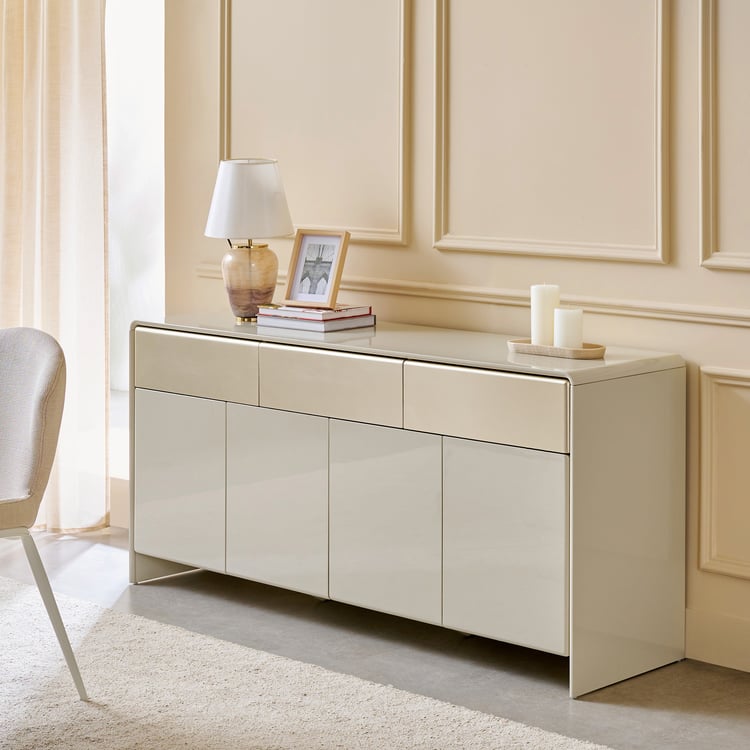 Elevate your dining room with this stylish sideboard, made from sturdy engineered wood. The prelaminated fibre boards, derived from compressed hardwood extracts, provide a robust core and excellent screw retention.